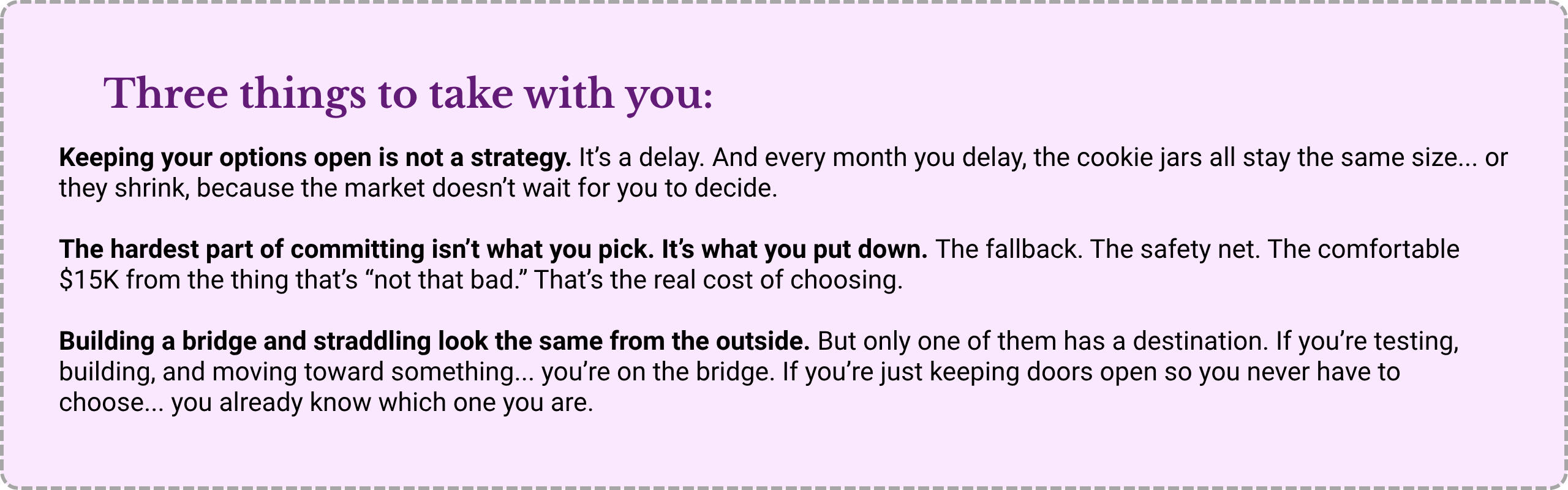 If you’re consulting on the side right now while you’re still in a day job... and you’re doing it deliberately, testing your offer, landing a few clients, building proof that this works before you make the full leap... that’s not straddling. That’s building a bridge. And a bridge is a plan.