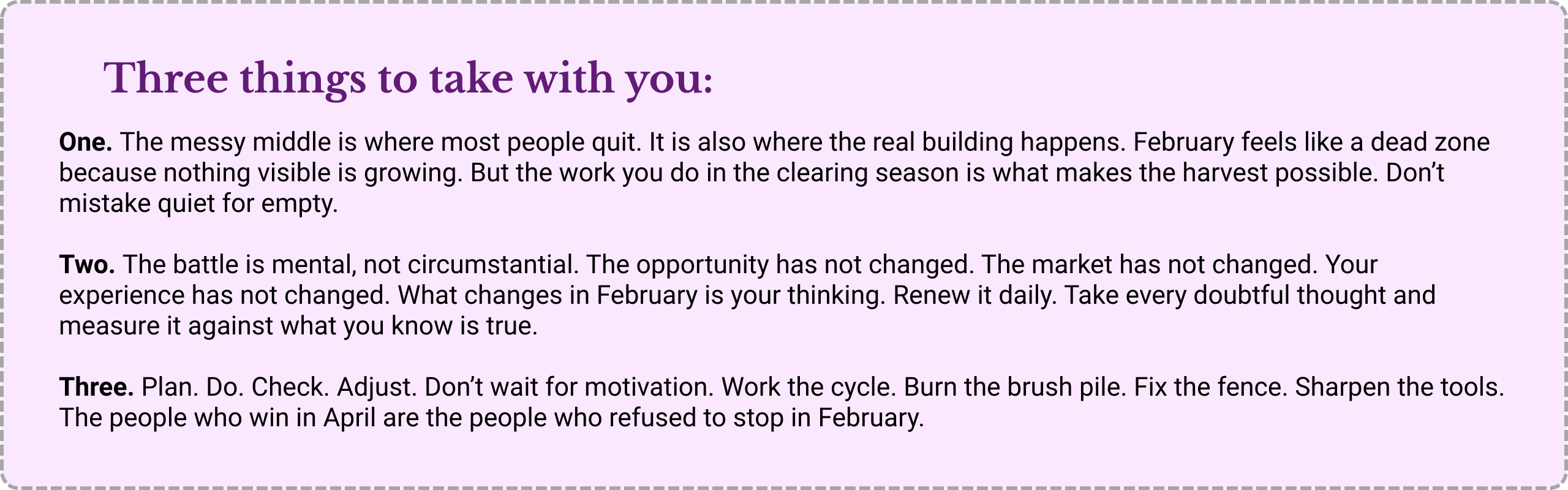 I know this stretch. Twenty-plus years of consulting and helping others build consulting practices. Twenty-six winters on this farm. And that particular kind of February quiet where nothing seems to be growing.